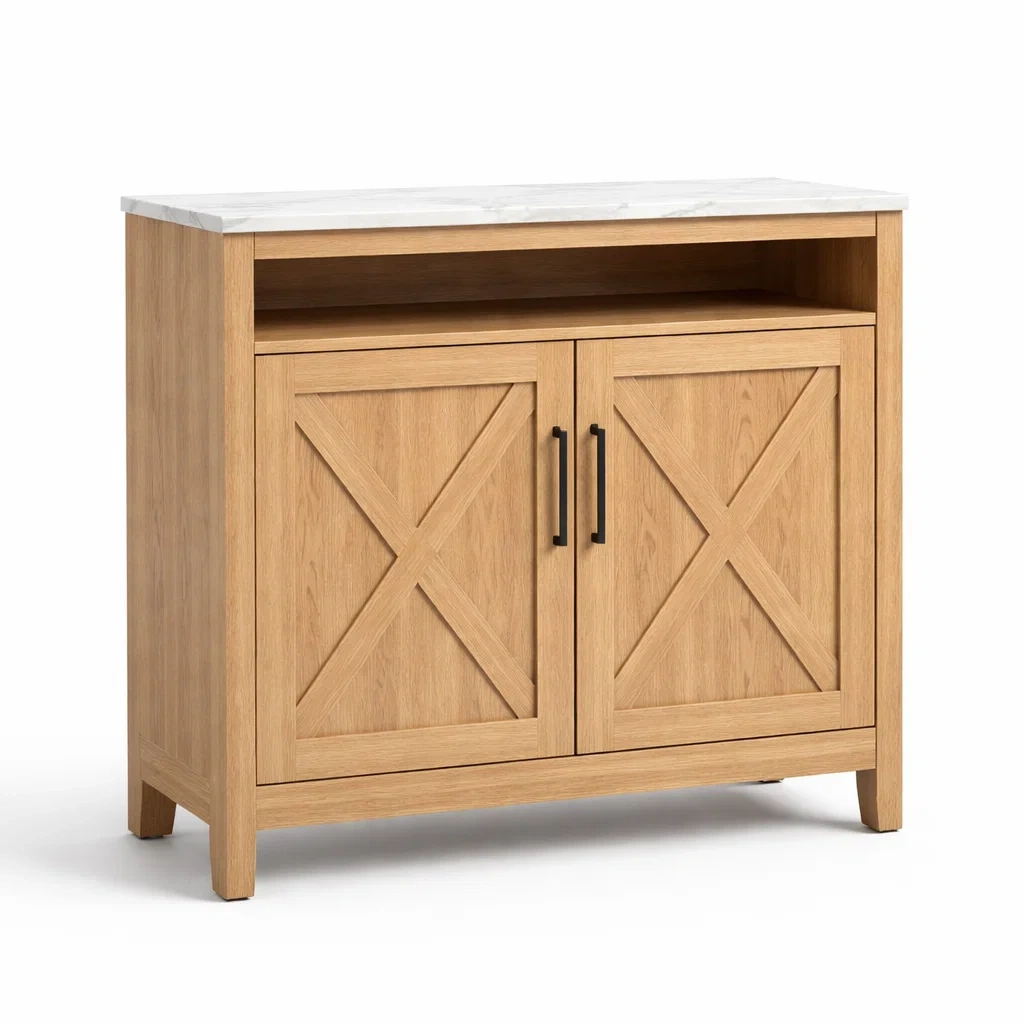 Die Kommode besteht aus Eichenholz mit einer MDF-Oberfläche im Marmoreffekt.