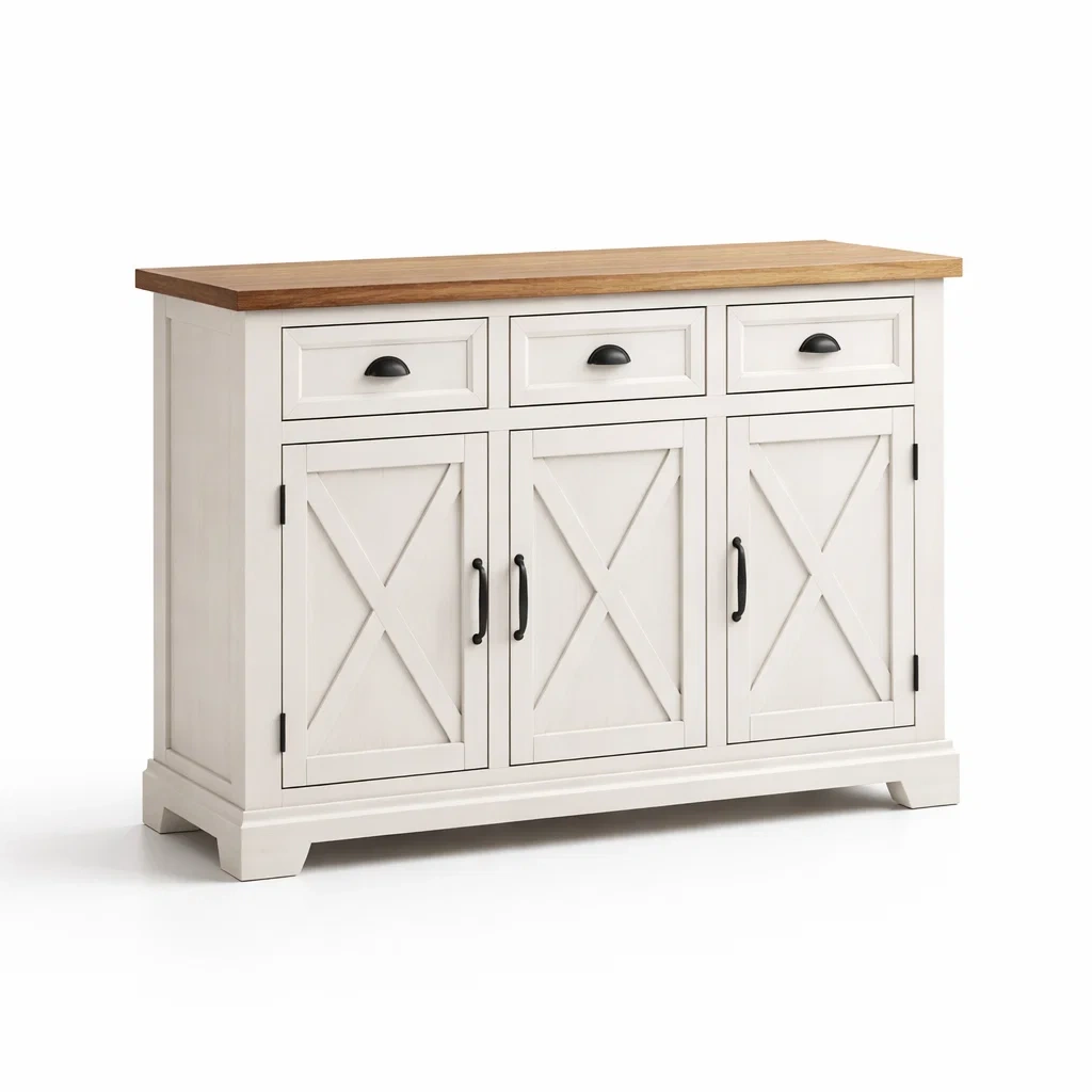 Das Sideboard besteht aus massivem Kiefernholz mit Eichenfurnier. Es bietet Stauraum mit 3 Türen und 3 Schubladen. Die Hauptfarbe ist Weiß mit Holz-Akzenten.